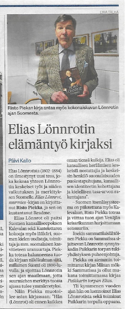 Ny bok om Elias Lönnrot av Paikkarin Torpan Tukis ordförande Risto Piekka.
